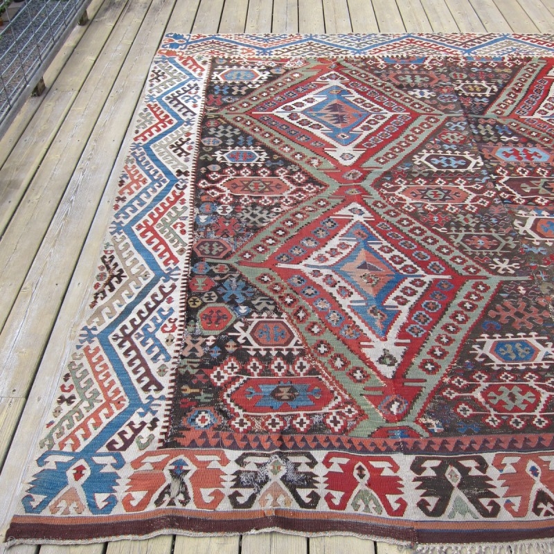 C.Anatolian kilim, 8'7' x 9" 2.74m x 2.44m, 3rd qtr.19th c. or earlier. Recently purchased from a family who has owned it for over 95 years, this Central Anatolian kilim has excellent colors including a rich deep aubergine. Although kilims are said not to have been valued highly in the early 20th c., it is evident that someone saw the beauty in this one and chose to create a room size rug. As a consequence, the piece has been shortened, and a 4th border added. Still quite useable, it is priced at a significant discount relative to other more fragmentary examples.