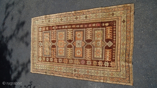 Caucasian Kazak (exact provenance unknown to me, opinions invited). Earlier 20th century, 6' 4" x 3' 6", uncommon earth tone colors and pleasing design. No significant oxidization, scattered small holes, otherwise even pile throughout. One passable diagonal repair and one end restitched, original selvedge is in good condition. Nice wall piece; still useable on floor. Very affordable.