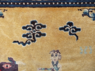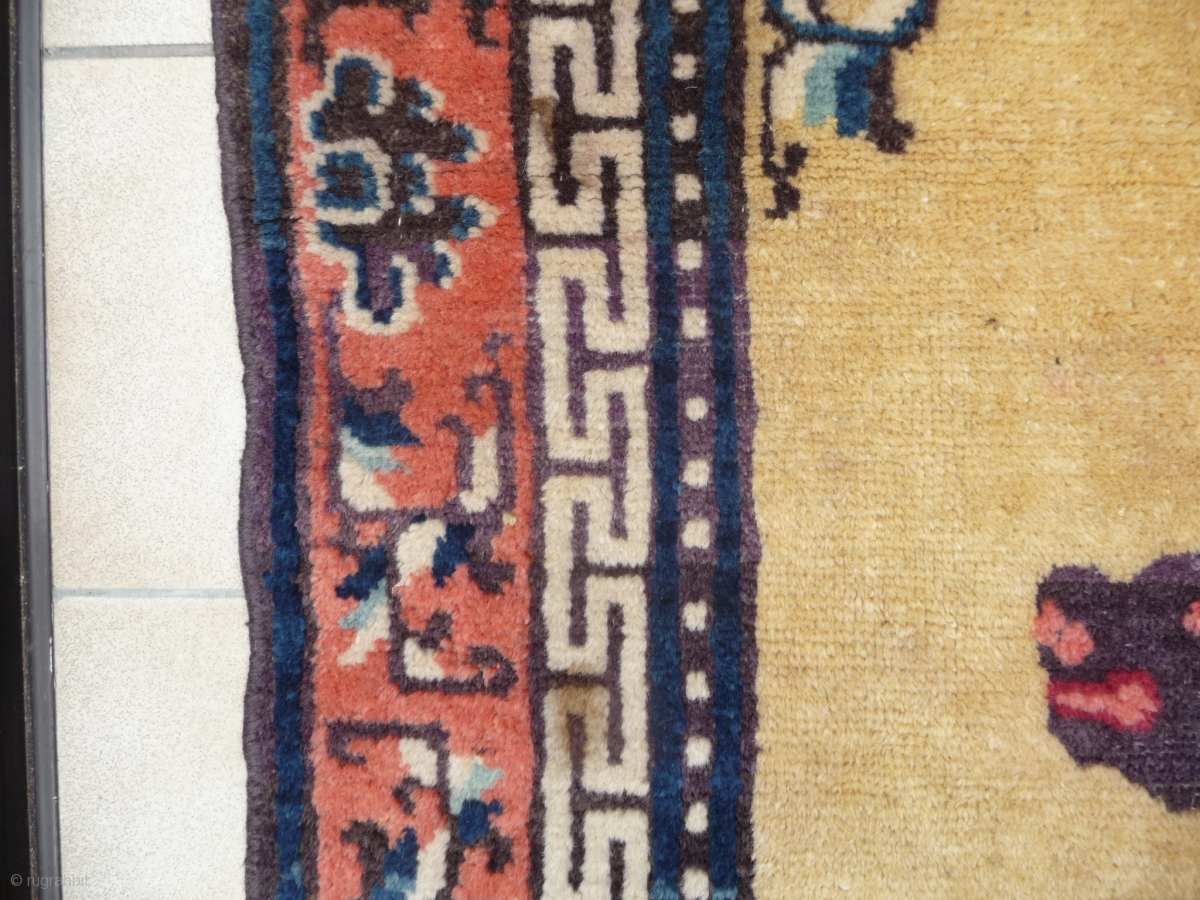 chinese rug with possibly some taoistic background as it possibly depicts an old well known legend; laozi leaving china to the west (in yumenguan , if i remember well) and writing the daodejing in one night. this kind of chinese realistic rug were mostly hanging, this one worn like this in its middle was made as meditation mat or later used like this?