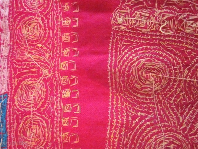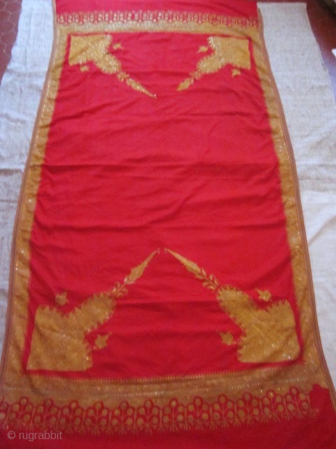 Interesting scarlet twill pashmina shawl embroidered with gold and silver Zari work. this kind of embroidery became popular in northern India and was made for special occasions from the mid-nineteenth century. The zari embroidery gold thread is a twisted spiral entirely handsewn on the twill pashmina. we can see kalka boteh surrounding red fringes and two brocades sewn on each side borders. Excellent condition.