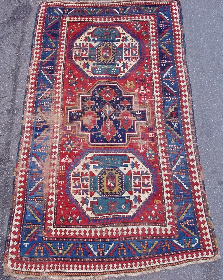 Colorful Kazak on a red ground with three medallions and several curious figures in the field. 3rd quarter of the 19th century. Size = 4'7" x 8'3". Inv. # 14692.
