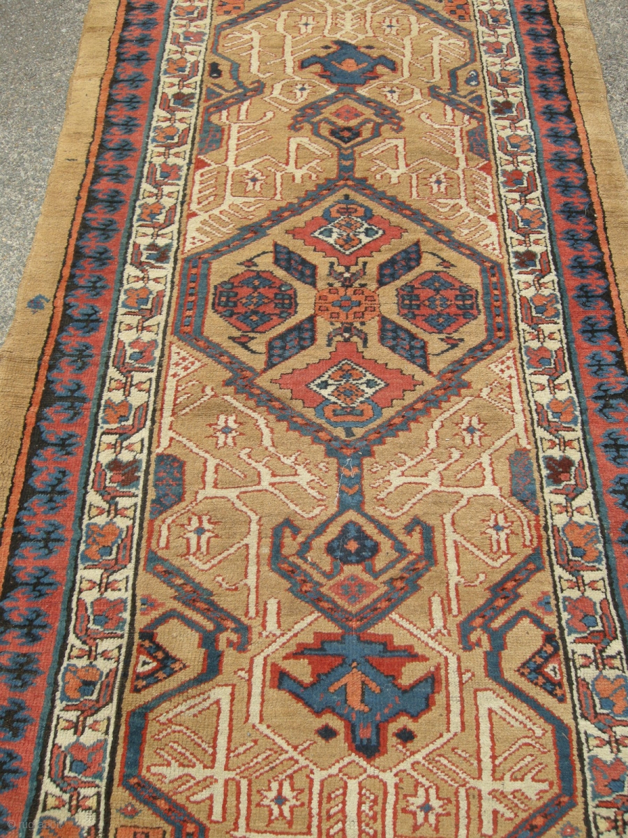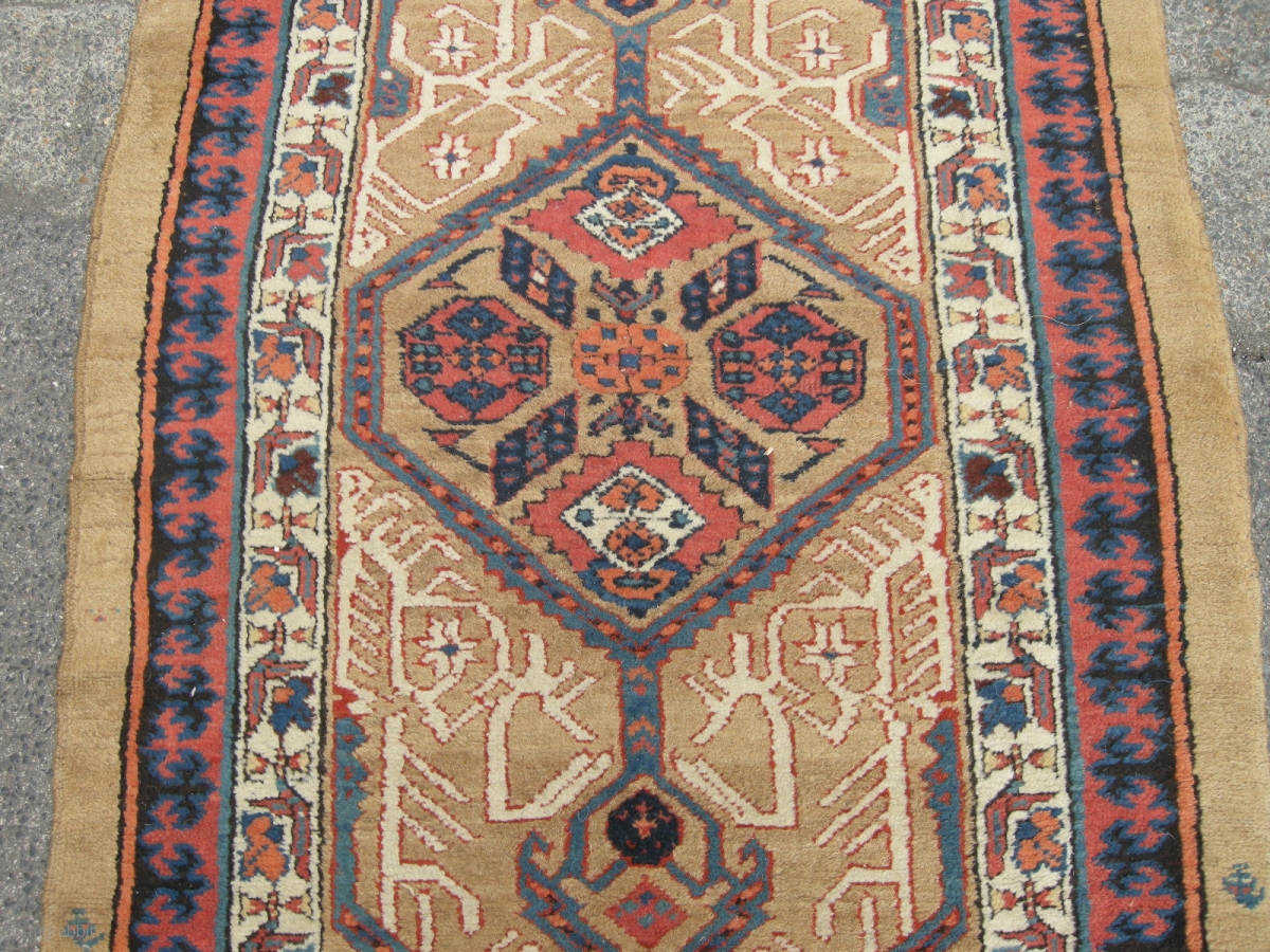 Dated Antique Sarab runner (1295 or approx 1878).Very good original condition no repairs ,one small finger sized hole,macrame ends unravelling. Slightly wider one end than other . a remarkably well preserved antique rug just bought needs a good clean.Approx 12ft x 3ft
