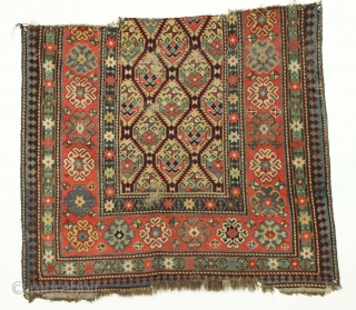 Early caucasian rug fragment. Beautiful drawing and world class color. All natural colors featuring a terrific yellow ground, real purples, rich greens and 2 reds. Thin with mostly good even low pile as shown. Reasonably clean. 3rd quarter 19th c. or earlier. 3'4" x 3'8"