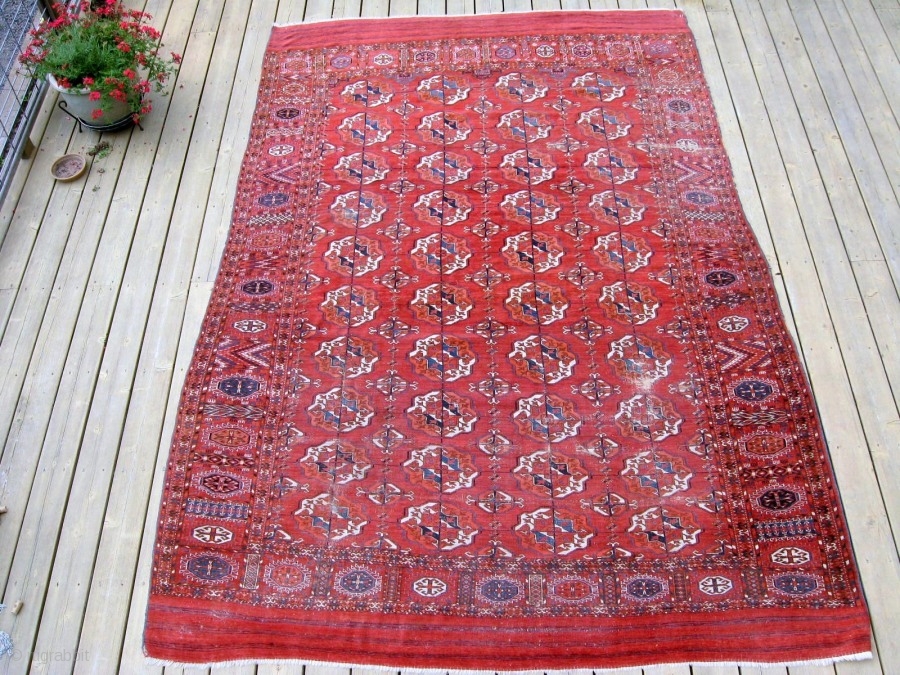 Elegant mid-19th c. Tekke main carpet, 10'5" x 7'2", featuring a minor gul related to the one used by the Salor. Major guls are nicely round suggesting an early date. Areas of wear, one small repair. Hi-res images gladly made available.