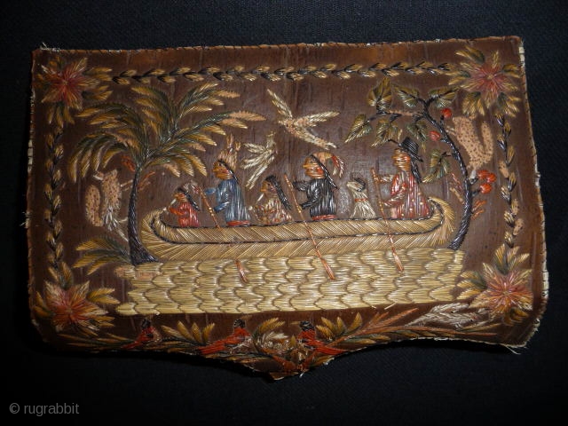 sold An exceptional Huron birch bark casket c.1820. charming scenes from American Indian life depicting a family in a canoe, a couple embracing, pipe smoking etc. exquisitely embroidered in dyed quill-work. a rare and evocative object recently found in the English countryside. sold
