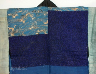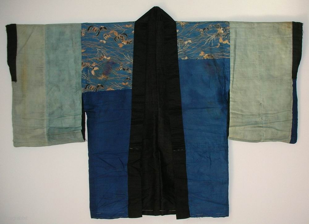 Han juban, Japan, late Edo (circa 1840), cm 120x81. The ‘han juban’ is an half length garment which is worn under a kimono. Those used by women were, in the past, mostly obtained by patching together silks obtained by discarded kimonos, and the results were often amazing assembles of multi-coloured silks. ‘Male’ jubans were (starting from Meiji) usually more conservatively done, and obtained from new silk fabrics. However, during Edo, it was not uncommon to find patchwork male jubans too, as it is the case with the present item. Diverse old silk fabrics, in the shades of blue, have been shaped to obtain this lightly padded underkimono. The result is awesome, with aqua silks facing deep sky-blue patches and a great fragment from a luxury kimono where ethereal butterflies populate the space together with plants in a sort of Pandora-like planet… The solid black lining is the icing on the cake. In rather good condition, with just some staining from a past bad wash encounter a red cloth, this is a jacket that stands out due to its great visual appeal. Truly lovely and much recommended.