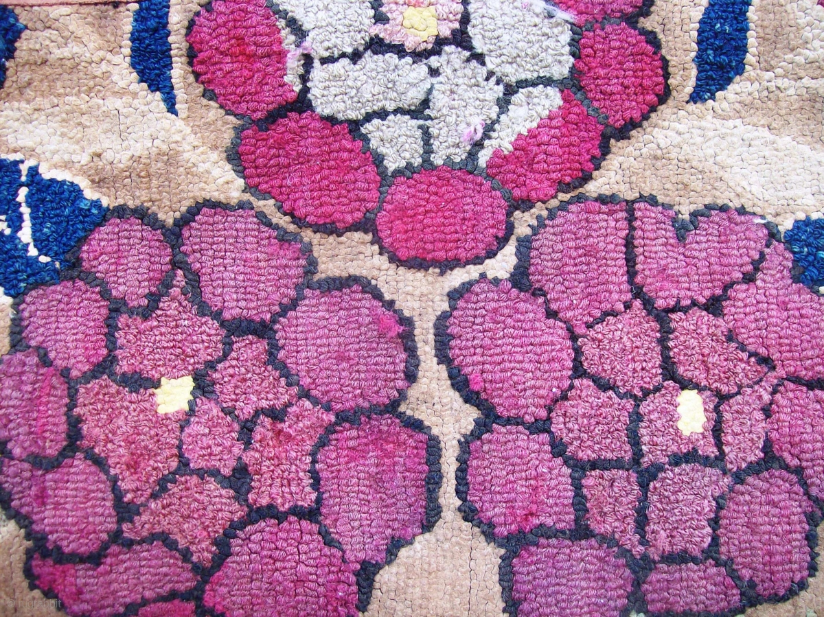 Hooked Rug - 2.11 x 1.8 nice example of american folk art. missing upper end, side gouge, soiled areas. needs thorough cleaning.