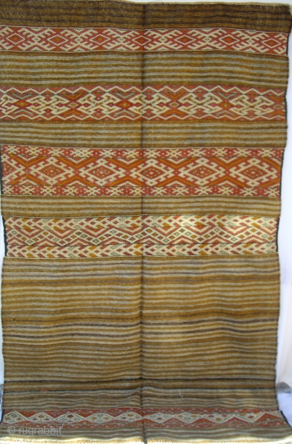 moroccan middle atlas kilim/bag. Very large flat weaves such as this which have most of the embroidery on the top section are first folded horizontally into half. They are then stitched up both sides to form one giant bag. They are then folded vertically and stitched down the centre and this makes two large upright storage bags. This is an old example from the Middle Atlas. Reference 2112. Size 246 x 140cms. sold. thankyou.
