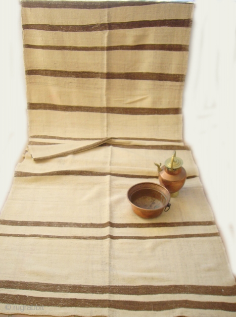moroccan middle atlas kilim - This extraordinary flat weave is woven from soft, silky, undyed hand spun Berber wools. It is a very long piece which probably owes its excellent condition to its limited use for ceremony or special occasions. The kilim is from the Ait Youssi Berber group in the western Middle Atlas. Ref. 2153. Size 400 x 126 cms. Euros 475.
