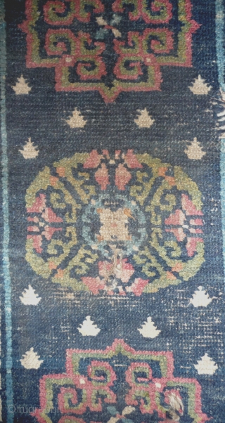 interesting old design on this early 19th c tibetan khaden, nice weave and colors.some condition problems, but easy restorable if needed.