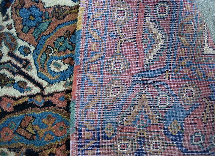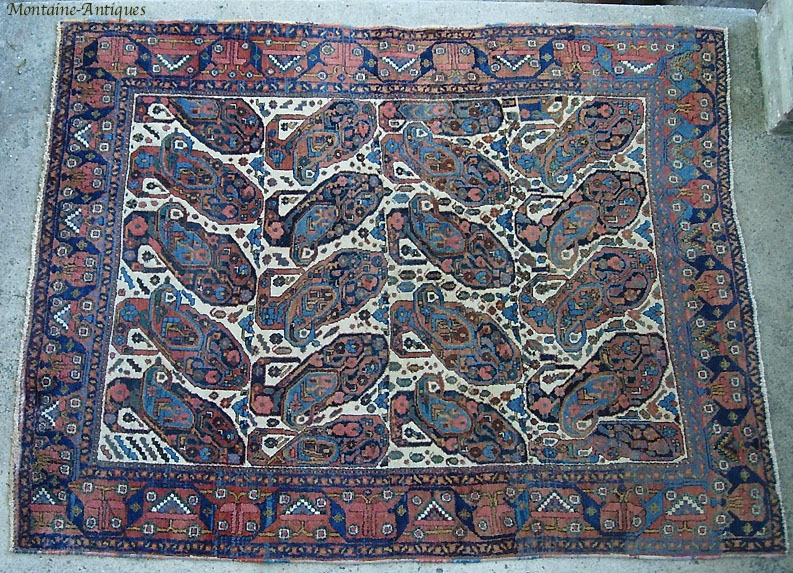 Ivory Boteh Afshar, 4.3 x 5.7, early 20th century. Interesting “Mother” boteh giving birth to child. Wonderful array of vegetable dyes with subtle abrashes. Soft wool is lovely to the touch. Extremely useful and hard to find size. a few moth spots are pretty innocuous. One end has a 6 inch miter to lay flat-- also pretty innocuous.