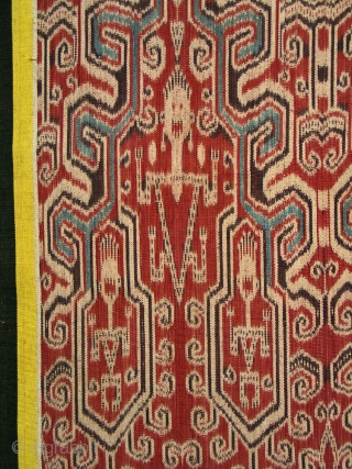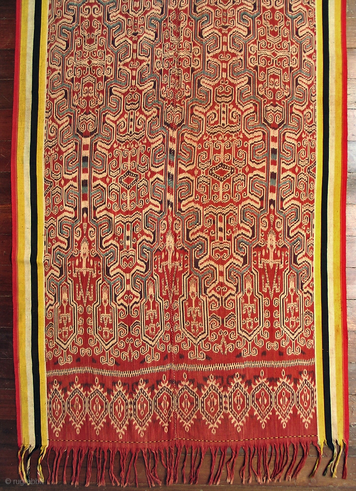 Description: a very fine, ikat ritual / ceremonial hanging (pua) woven by the Ibanic people along the Kalimantan/ Saribas border, with a beautifully detailed and intriguing pattern executed in fresh brick red, soft blue, dark brown and ecru. The pua was woven in 2 mirroring panels that were sewn together along the selvedge, and the design is moves upwards from human figures at the base of large, interlocking blue-hooked rhombs. The intricate delicacy of the design balances between the organic, vegetal hooks and a patterned symmetry of design, and between the figurative and the abstract. Solid striped bars extending above the heads of the larger figures suggest tree trunks, but the expansive blue outlined forms also resemble some cloud patterns made by the Sarawak Ibans. The variation in the thickness of blue, white, red and dark brown outlines creates a sophisticated three-dimensional effect, the amount of blue used is rare and gives a strong emphasis to a design which has an overall fresh, lively elegance.