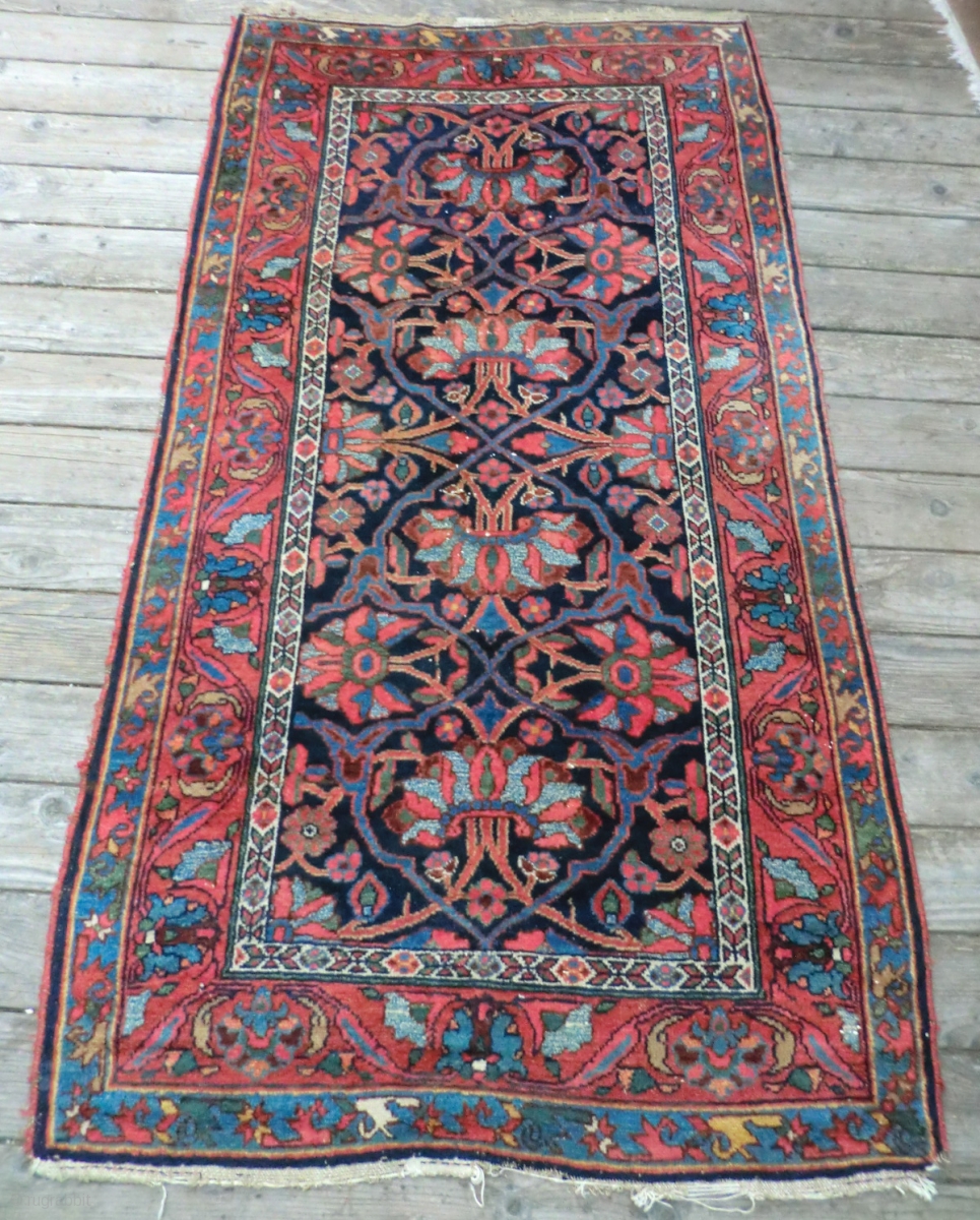 This is a very nice, true antique Persian rug. It has a natural wool pile and a cotton foundation. The condition is excellent-all original with no stains, repairs or touch ups. Both end guard are still present although one is in need of repair (see photo 9). The rug features an exceptional color palette with no chemical dyes. It is evenly worn with plenty of plush pile left.