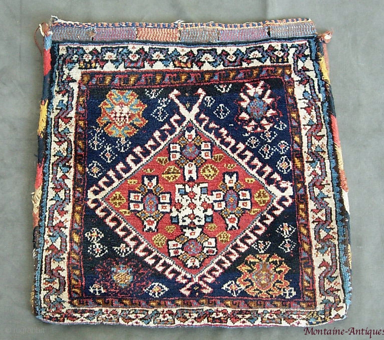 Luri Bag, 21 by 23 inches, early 20th cent. Original back with nice embroidery at the top. Fine natural colors with soft thick pile. Excellent, original condition. $15 to ship anywhere in us.