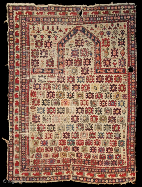 Marasali rug Late 19th Century with great colours on an ivory field. Obviously more of a fragment due to missing quite a lot of borders on one side. Has a few tears and holes in places but a good honest old caucasian rug. sold
