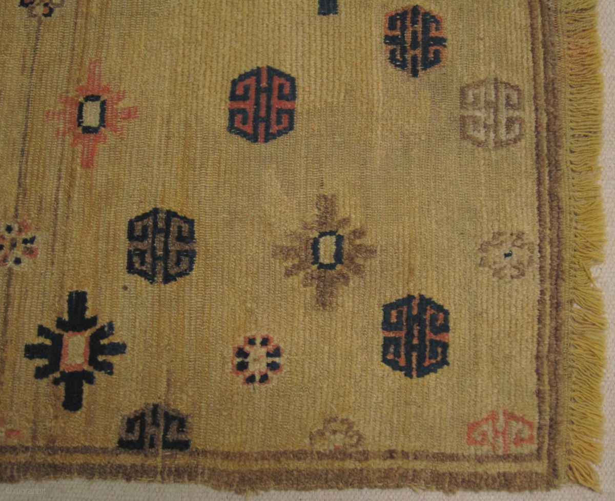 Mid 19th century Tibetan Prayer rug in Ningxia yellow, size 84cm x 141cm, Fringes on both ends are not original there are three small repairs in the field. Pile wear to centre. All vegetable dyes.