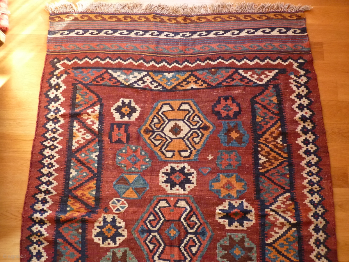 New importation from s.w. Iran Baseri kilim, 231x161cms, end of 19th century, all natural colours with a nice harmony and a lovely turquoise blue, spontaneous improvised composition, excellent condition with one or two minor weft re-weaves.