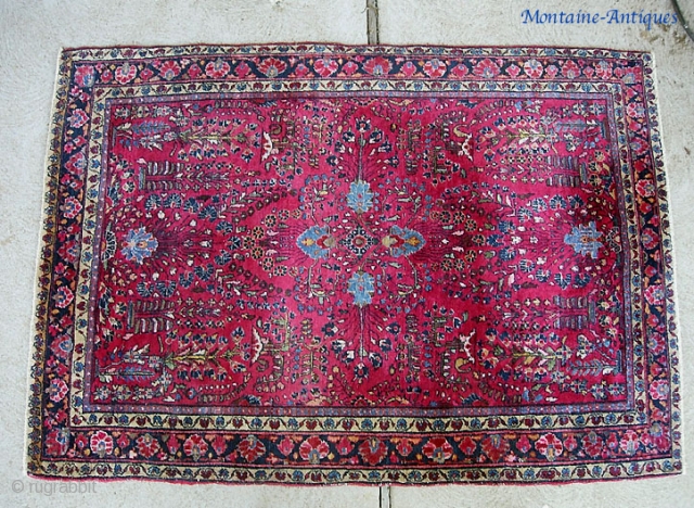 Nice silky plush American Sarouk. 3 ft 5 inches by 5 ft. Fine tight weave and thick pile. Wool has wonderful sheen. Clear and crispy design. Very lively rug. Ivory abrash on ends makes it look like its missing more than it is. a good rug to throw on the floor and walk on for another 100 years.