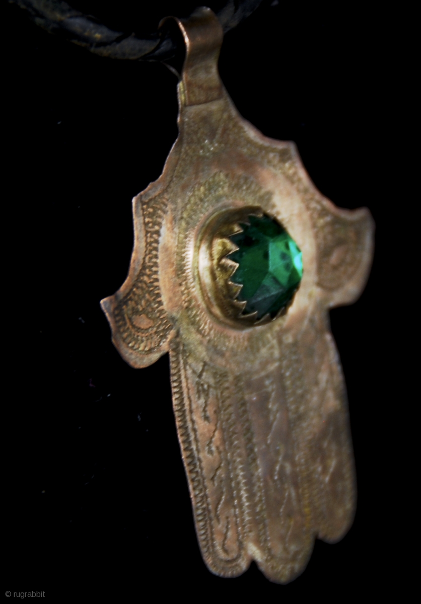 Old Berber pure silver and green Czeickh glass bead Hamsa or Fatima's Hand, hand made amulet from Morocco, High Atlas region.