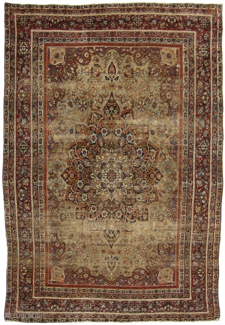 Oversized Lavar Kirman Carpet, ca. 1875, 9'10" x 14'10". Wool pile on cotton foundation; 270 Persian knots per square inch (18 x 15). Beautiful natural colors, including the shaded camel/olive field, rich concord grape borders and persimmon highlights. Some foundation visible, a few small holes, minor moth areas front and back, but plenty of luxurious original length pile in the borders. Soft, clean, no splits, no hardness, no cracking. (Inventory Number 395.)