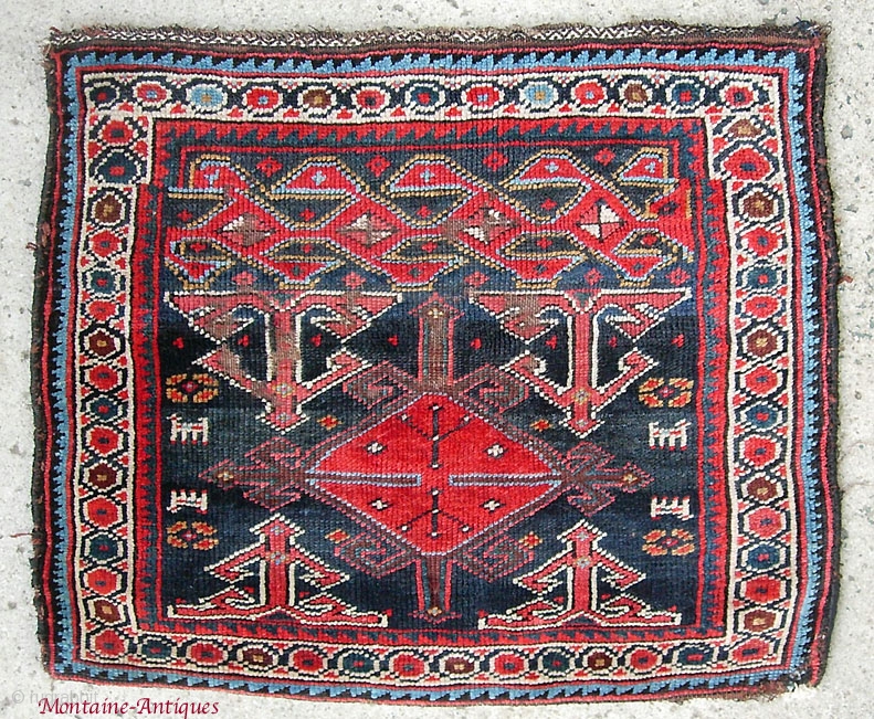 Persian bag face, 20 x 24 in., possibly Shahsavan, ca. 19th century. Unusual bold design; lively and dramatic colors. Some ferric oxidation in places; otherwise nice condition with originalsides and ends. The photos tell the story regarding condition. $10 to ship anywhere in us.