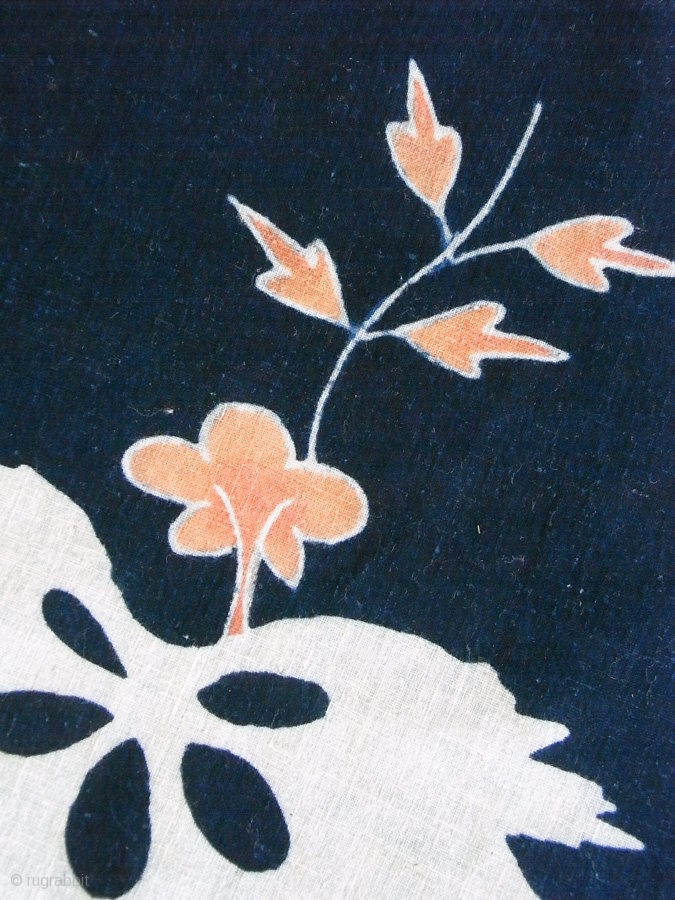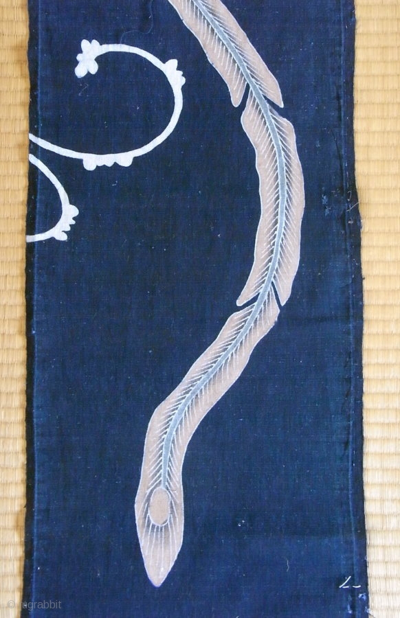 Phoenix feather and pawlonia indigo tsutsugaki panel, Japan, Meiji (circa 1890), cm 157x32. Striking panel of hand-drawn rice-paste resisted tsutsugaki indigo cotton, dating to the second half of Meiji period (1868-1912). It features a colourfully hand-pigmented tail feather from a ‘ho-o’, the Chinese phoenix that was often the subject of tsutsugaki images. The motif also features stylized ‘kiri pawlonia’ tree leaves and flowers, said to be the only tree on earth upon which the heavenly phoenix would alight, and then only in times of perfect peace and harmony. Other than some weak threads, and the tiny repair along the selvedge visible in one of the detail images, this thick homespun cotton is in fine condition for its age, with botanical indigo that is deep and dark, and mineral pigments that, though somewhat faded, are still quite lovely. a wonderful piece to re-work into something original....