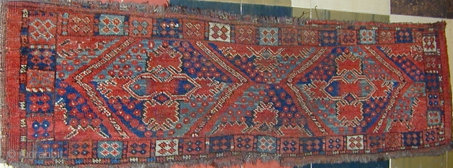 Rare and unusual Ersari Jollar (showing a spotted dragon in the bottom left and right) with exquisite colors including a true green; original side cords, remnants of original kelim on bottom edge, early 19th. century, 56'' x 15''(143 x 38cm)