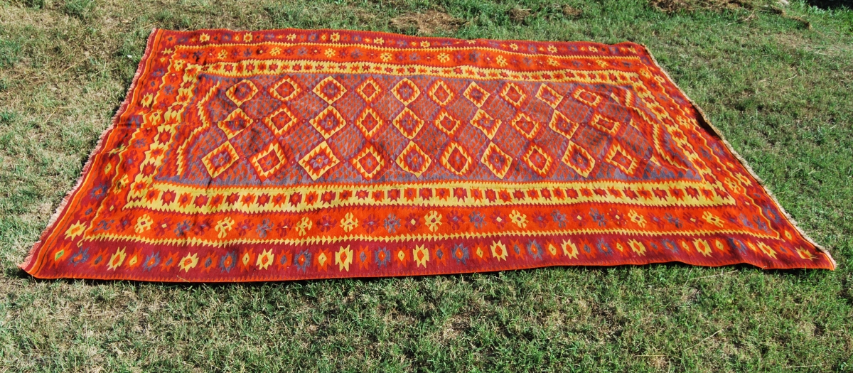 Tracia Orange Kilim from the Ottoman Balkans. Cm 390x315 or ft 12.8x10.3. Second half 19th century. In overall good condition. 2 or 3 small holes, some old minor restorations. Rare, beautiful.