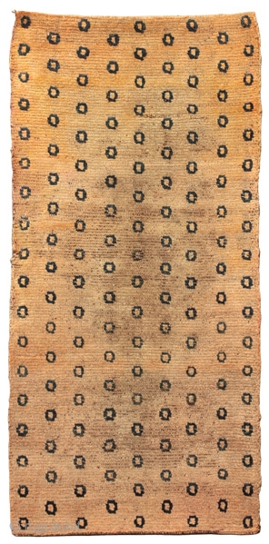 Recently sourced in Tibet, this unique rug is distinguished by a repeat pattern of small circles which resemble the leopard’s fur, an interesting variation on the more common tiger skin design rugs which are considered items of high rank and which are highly coveted in the collector’s market. It is plausible that this piece was intended as a meditation rug for an important Tibetan Lama.