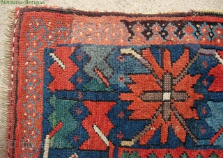 Sauj Bulaq Kurd 4 x 8.4 ft., circa 1890. Great fat Genge border with wonderful clear natural reds, green, some aubergine; the field design is what Stone 2004:216 identified as "Sauj Bulaq Memling Gul and Flower." Majority of weft is red but some alternating blue as well. Honest old Kurdish reweaves at one end. Aside from this it is in choice condition with full pile, original ends and selvedges. a pretty cool thing for the Kurd collector who thought he had everything.