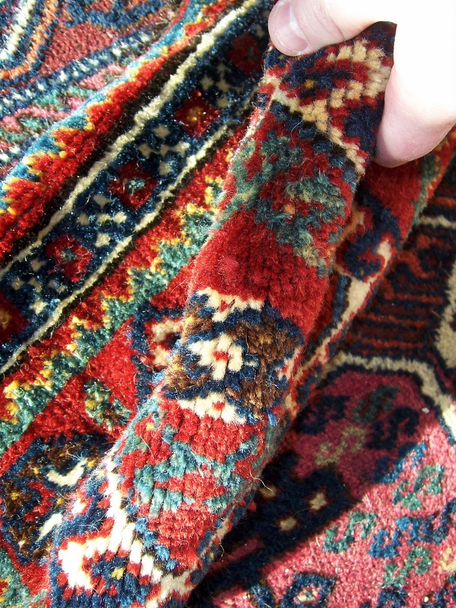 Shiraz bagface, 17"hx18"w. Probably Fars province. Very saturated colors. Good pile on the front. Back has a repair, and top of back needs to be secured. Sides have original horse hair selvedges (thin in a few areas). Please check out my other listings, and see http://picasaweb.google.com/joseph.beck/BagsTrappingsAndFragments# for more photos.