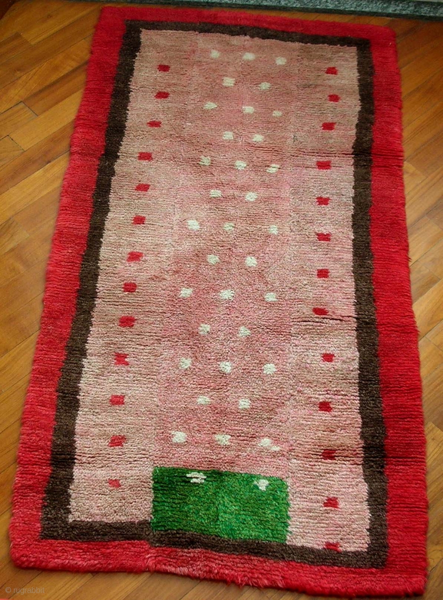 The ‘skyscraper’ khaden, Tibet, early 20th century, cm 155x80. Tibetan rugs in so-called ‘tsuk-truk’ technique (woven in narrow stripes - then joined - on small back strap looms) are probably the survivors of a nearly lost tradition of early nomadic weaving. They are often quite ‘minimal’ in their look, and therefore appealing to those appreciating modern art aesthetic.
