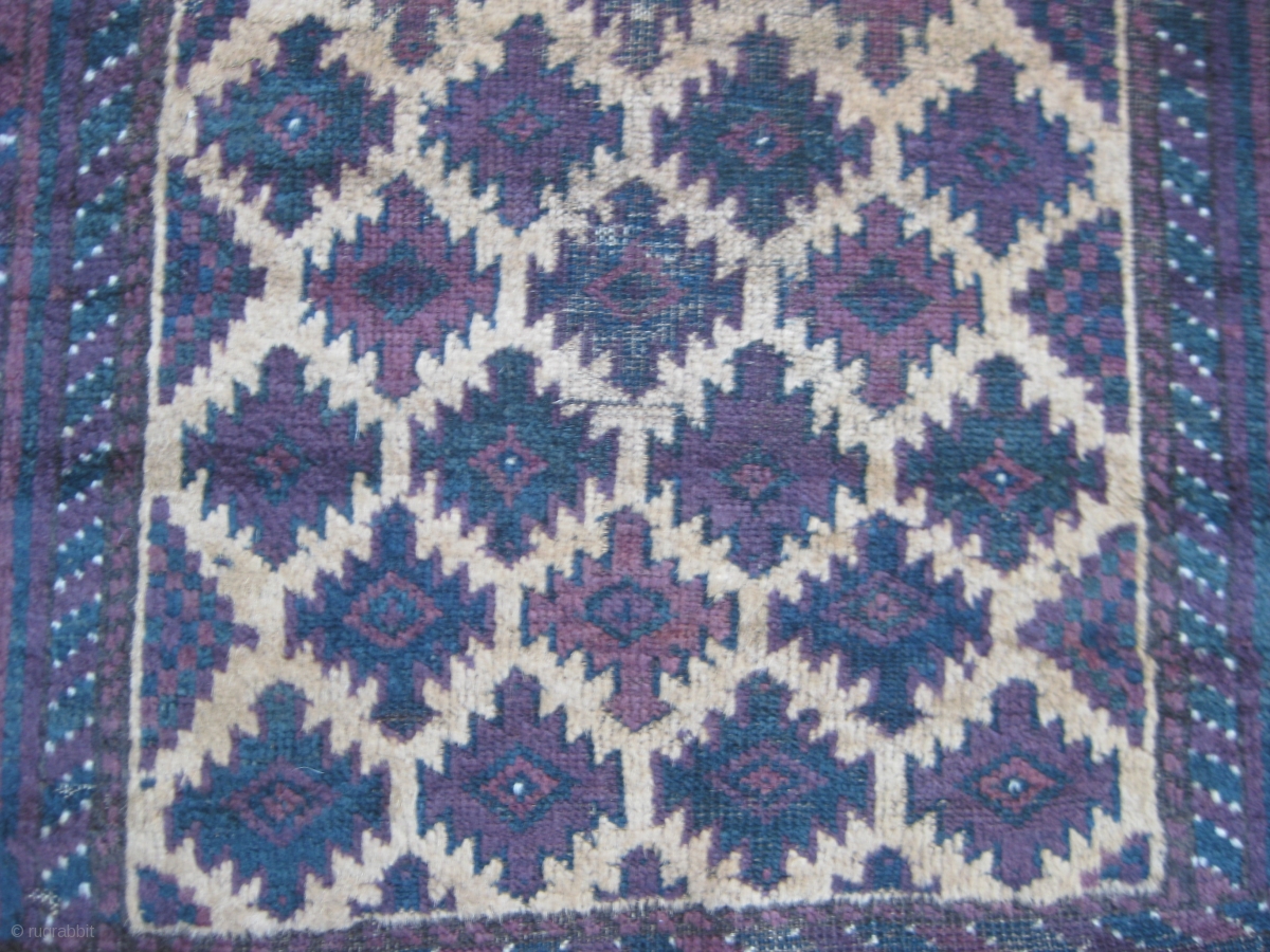 Early Baluch balisht. Natural camel hair. Nice green and aubergine colors. Some worn areas as shown, but complete with original goat hair side cords and remnants of kilim ends. Wonderfully glossy silky wool and soft handle. All natural dyes. Very fine weave. Size 50X28in/127X71cm. Washed.