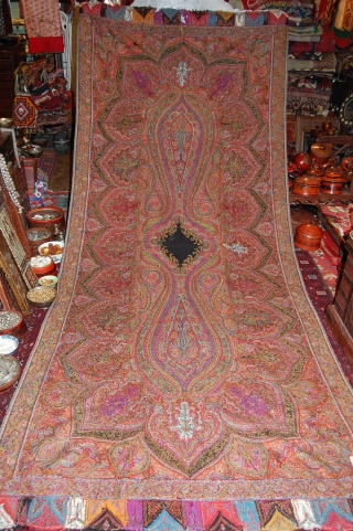 Spectacular Indian Pieced shawl, Very fine embroidery, vivid cand fresh colours, as seen in the picture have got few holes, but a great piece.