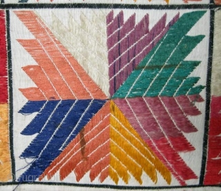 19th c., silk on cotton. Measures 28" x 13.5" (70x34 cm). Some wear and dirt, which you can see in the pictures. Could use a gentle hand wash and the colors would pop even more. Would look great framed or hung on the wall.