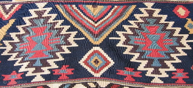 #t1000 Caucasian (Shirvan?) kilim, 4'10" x 12'10"; impressive single- piece flatweave with large-scale graphics rendered in bold colors; unusual in that instead of the normally repeating rows of similar design elements, the lower third of the piece is quite different than the upper portion; excellent condition; 19th century. (note: