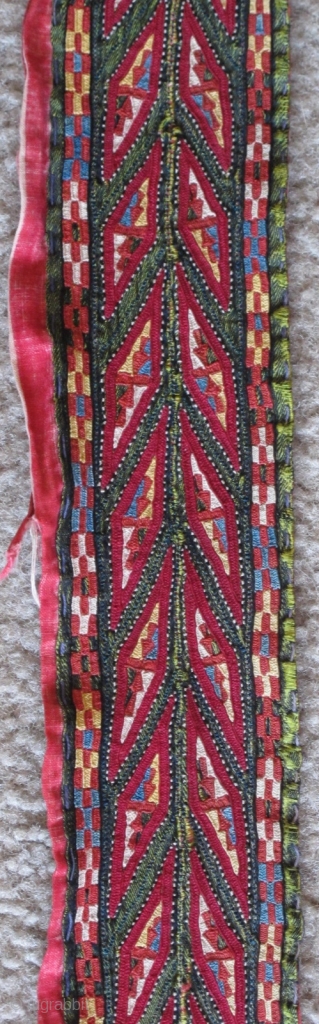Tekke Turkmen embroidered band. Very fine. Very colorful with several blues, yellow, orange and insect red. Embroidered on a hand-woven green silk. 105x6cm