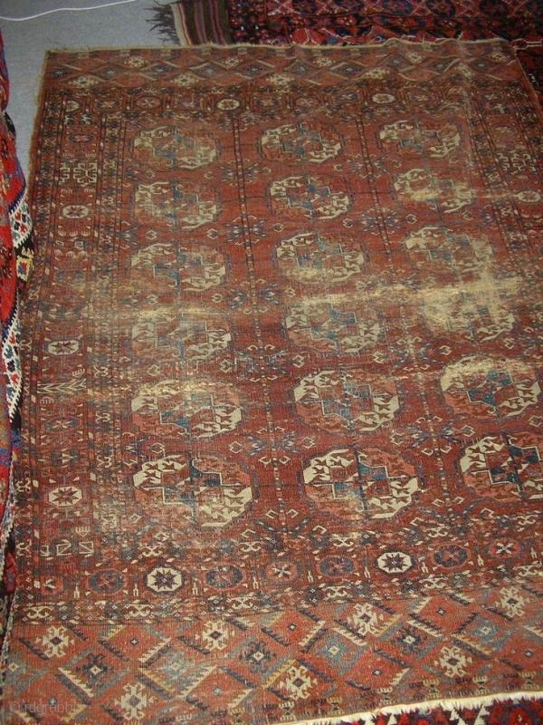 a Tekke "wreck". This well warn small rug is most likely early19th century. It has interesting pattern details and colours.