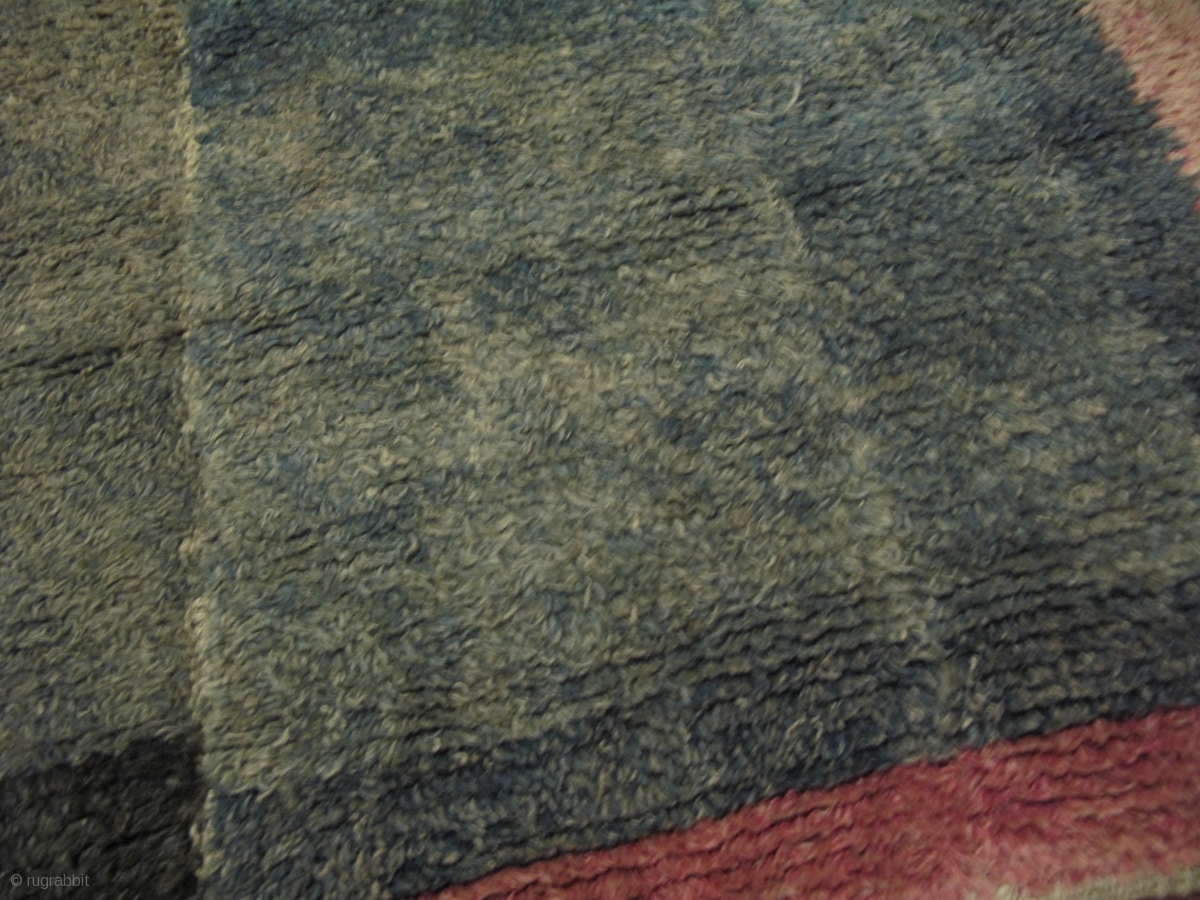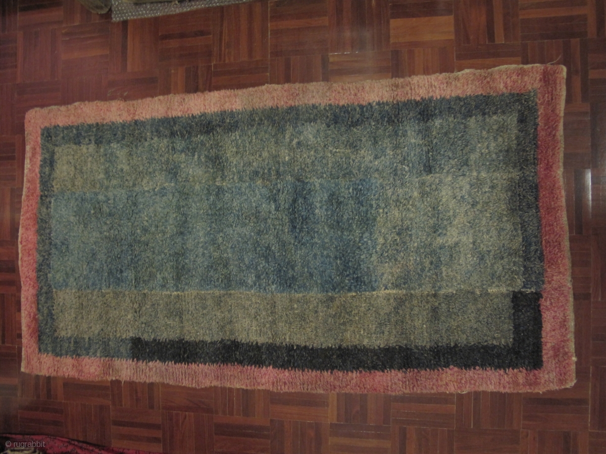 Tibetan Tsukdruk, looped pile rug - a primitive form of ancient nomadic tibetan carpet weaving. 3 long strips sewn together vertically. Very nice hue of green in the centerfield, Excellent condition, Approx early 20th century