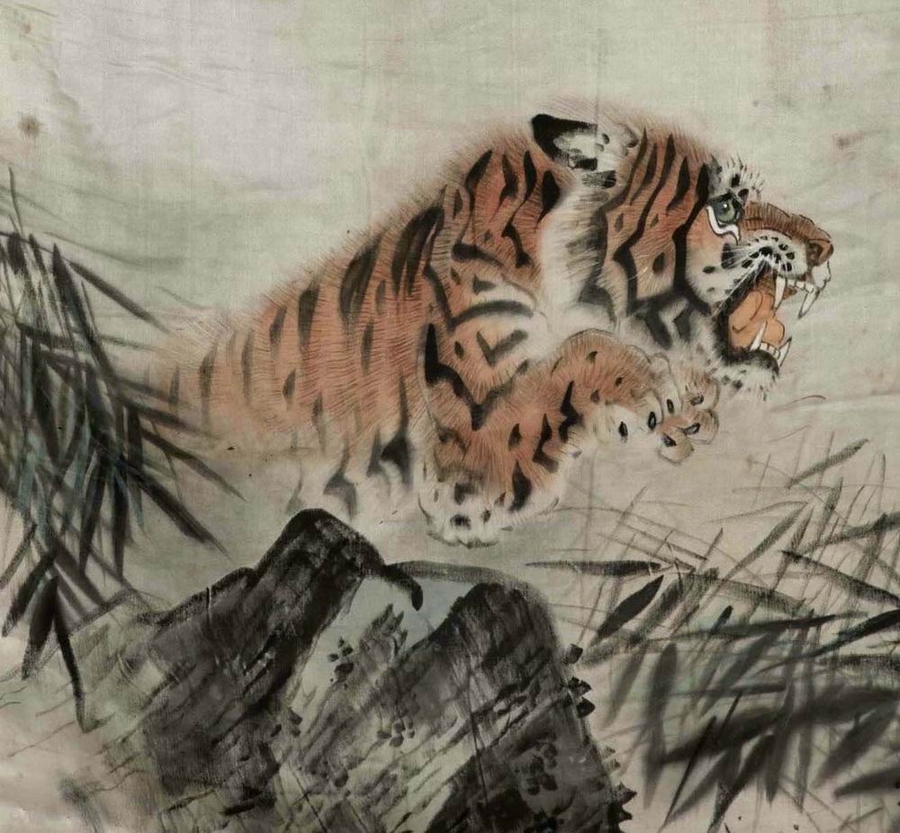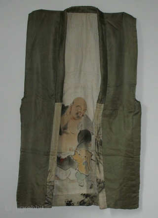 ‘Tiger’ han juban, Japan, Meiji (circa 1890), cm 94x54. The ‘han juban’ is an half length garment which is worn under a kimono. Those used by women were, in the past, often obtained by patching together silks obtained by discarded kimonos, and the results were often amazing assemblings of multi-coloured silks. ‘Male’ jubans were more conservatively done, and obtained from new silk cloths sometimes, in the most prominent ones, hand-painted with auspicious motifs or situation from tales or legends. The present lot is such a case where, on a pearl silk cloth, a tiger – symbol of strength and moral integrity - has been painted. Also the lining has been decorated, possibly with a scene from a tale i couldn’t identify, though. In very good condition, with just some little sign of use and age, this is lovely item indeed. Recommended.