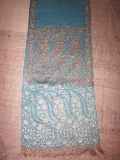 Turquoise pashmina is very fine, soft and high quality!. The embroidery silver thread work is unsurpassed. Rare piece in good condition with provenance!.