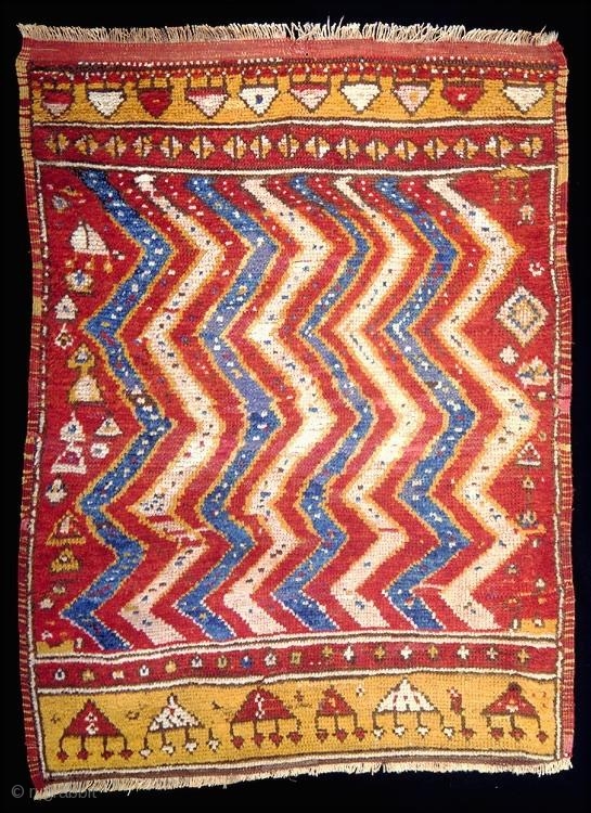 Unique Anatolian village rug, mid 19c, popularly called Konya, but probably woven in the Cappadocia region. The zig zag pattern imitates a familiar design in Ottoman textiles, particularly those used for funerary purposes. The motif is also found in eary architectural brickwork.