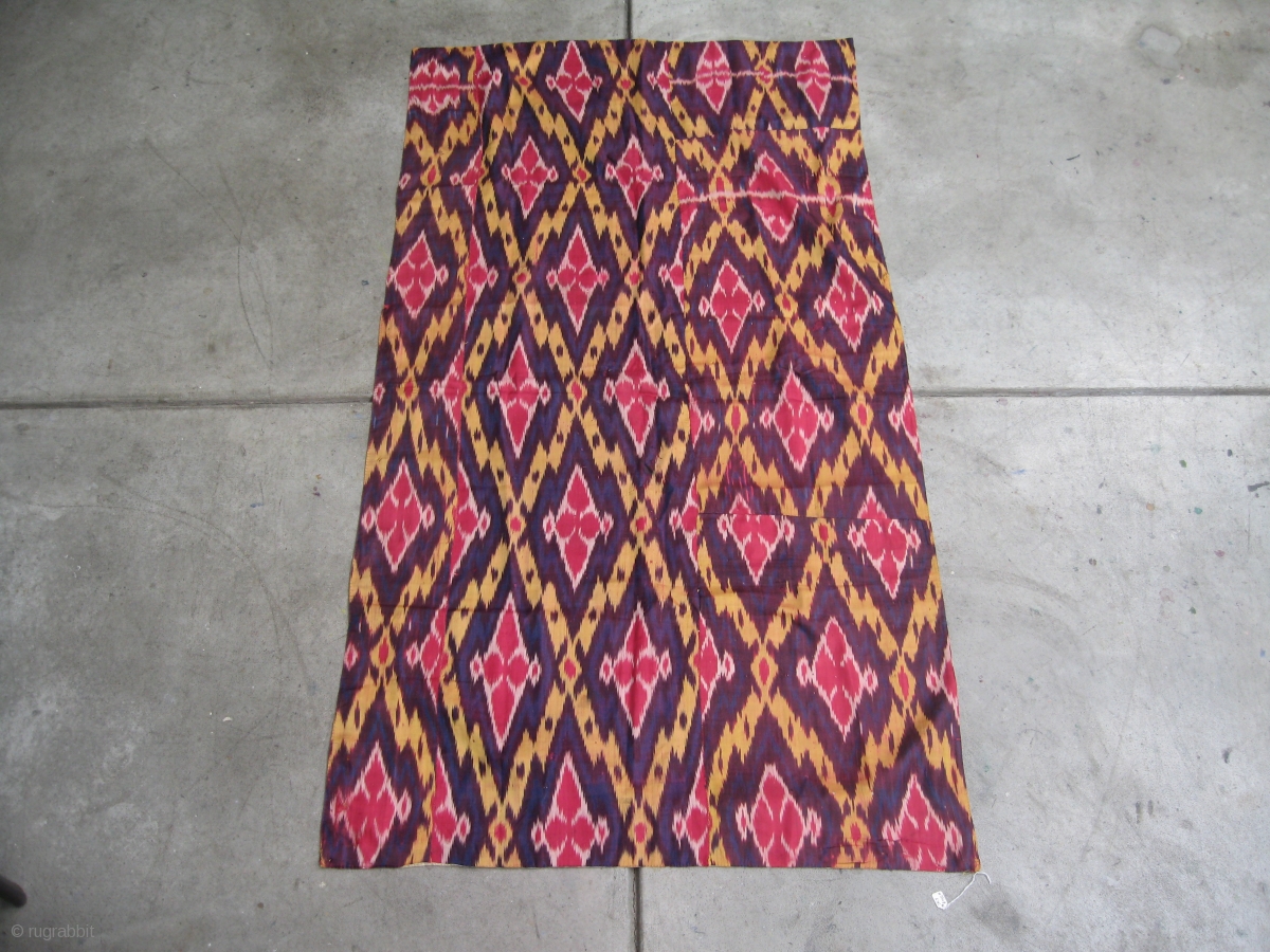 Uzbek all silk ikat panel. Late 19th century.Five colors.63 x 34 inches.lined with Russian cotton trade cloth. Condition good with one tiny stain .