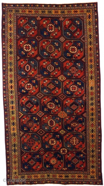 This early example is characterised by its design of large gulli guls, most of which feature different inner decorations, with repeatedly different secondary guls. An ancient treatment of pattern, typical of Turkish rugs of the Seljuk and early Ottoman period, can be seen in the empty space left in proximity of the border, as if the frame is not interrupting an infinite repeat but only containing it. The very unusual border of connected totemic-like forms adds another archaic touch to the composition.