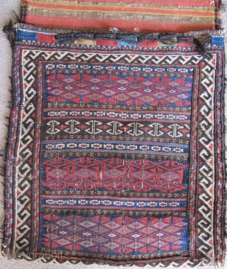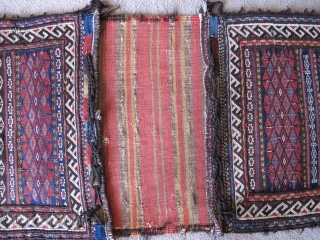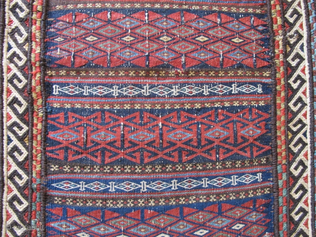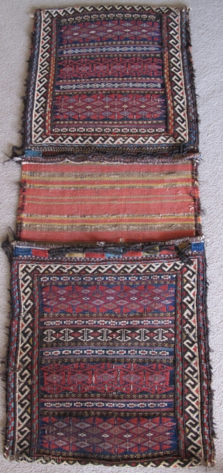 Very Rare, Very Old Complete Khorosan Quchan Kurd? ( or perhaps Khorosan Afshar ? )Double Saddle Bags (Khorjin). Bagfaces are done in bands of colorful floating weft work with wool and goat-hair cabling and sumak borders. Great colors including 3 blues, two greens, etc. Fantastic tactile quality. The kilim back of this piece as well as the floating-weft flatweave fronts have the feel of a very soft old Anatolian kilim. Neither coarse nor scratchy.