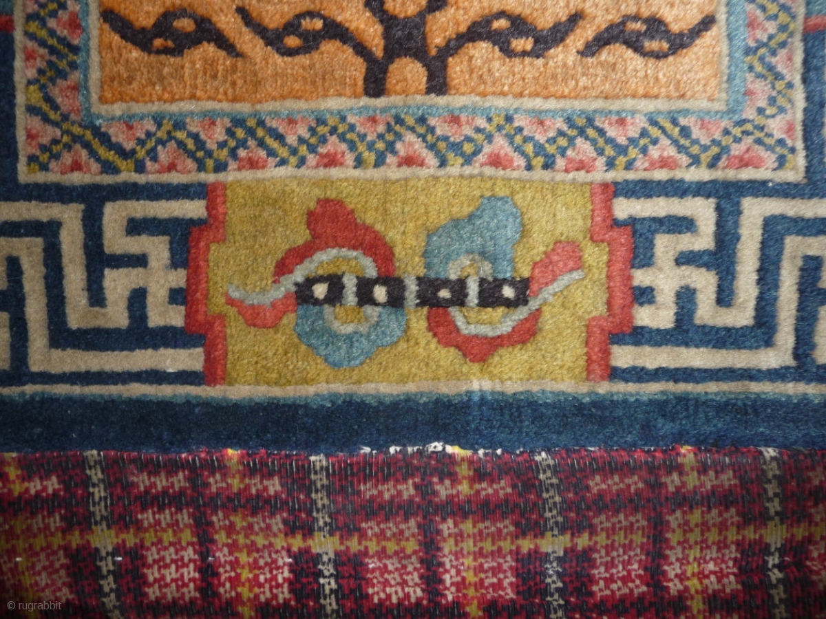 a very special chinese small tiger rug made probably in northeast china for northwest china, as it cames some years ago out of a buddhist monastery in the qinghai province (possibly a gift to the monatery as it was usual). interesting is that the border is not showing the 8 auspicious buddhistic symbols but the 6 taoistic one.