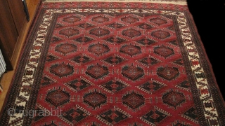 An unusual rug that probably dates in the twentieth century, although the style is usually much earlier. One synthetic bright red; don't think there are others, but i can't be totally sure. Measures 6 1/2 x 9 feet. Has some foldwear in the middle and two other places, and one corner is stretched slightly; does not lie totally flat. Full pile and could go easily on the floor. People more expert than me have suggested that it is a Soviet Turkmen rug, and also that it was made by either the Goklan or the Jafarba’I. i honestly don't know enough to affirm or deny these opinions. But it is an attractive rug, at a very attractive price. Asking $1500.