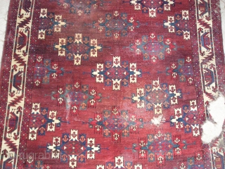 Yomut Turkmen Kepse Gul Main Carpet with a Boat Border (fantastically drawn). Great color, soft wool, dirt, hole, moth-damage, stains. kilim (which include cotton) on both ends and chords still attached on top corners. Older than most. 4'10" x 9'1"