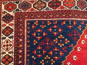 Afshar kilim, 2nd half of 19th century, 180X115cm. 3 rythmical diamonds on a brick-red ground, sorrounded by eye dazzler, rainbow-like saf-bordure. The ... read more