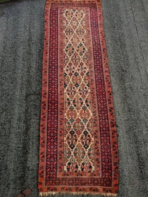 Older northwest Persian or Kurdish runner with camel ground. Overall fair condition with overall even low pile. Good colors. Interesting ivory main ... read more